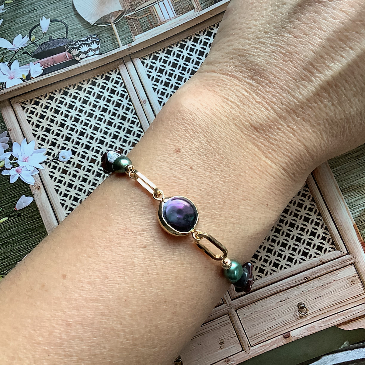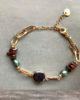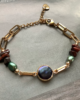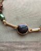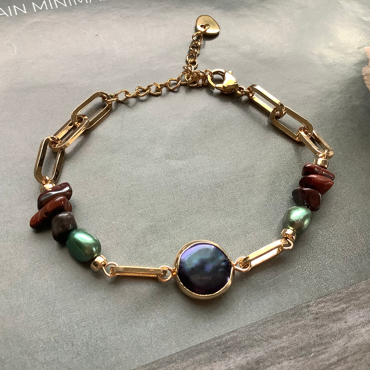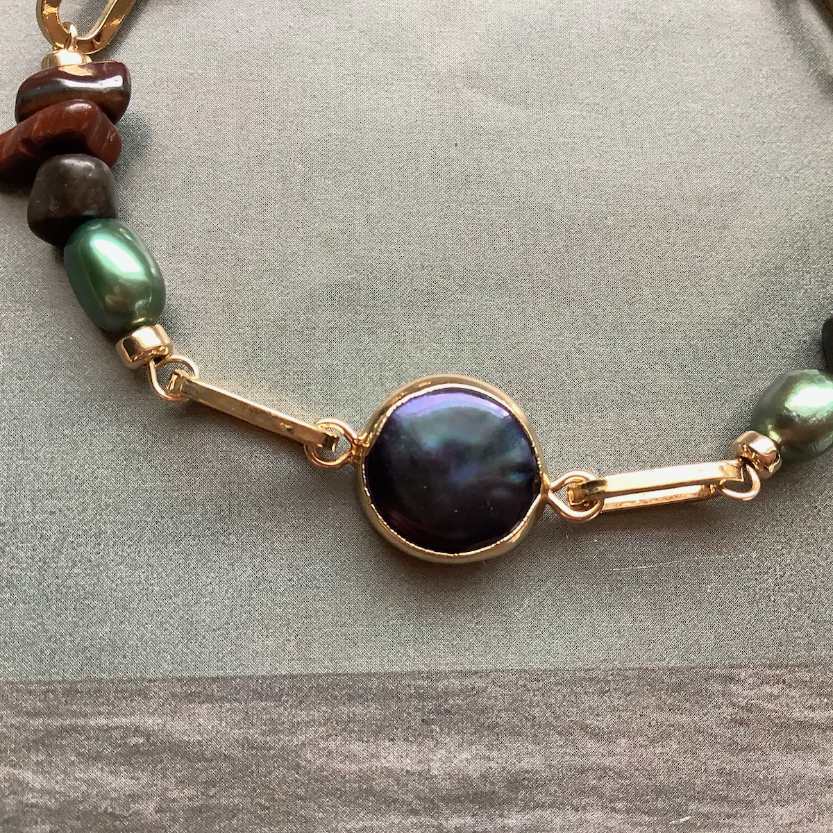 18K gold plated chain, natural green sea pearls, natural red tiger eye gemstones, stainless steel clasp and extension chain.