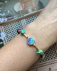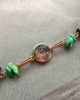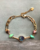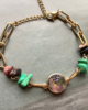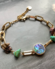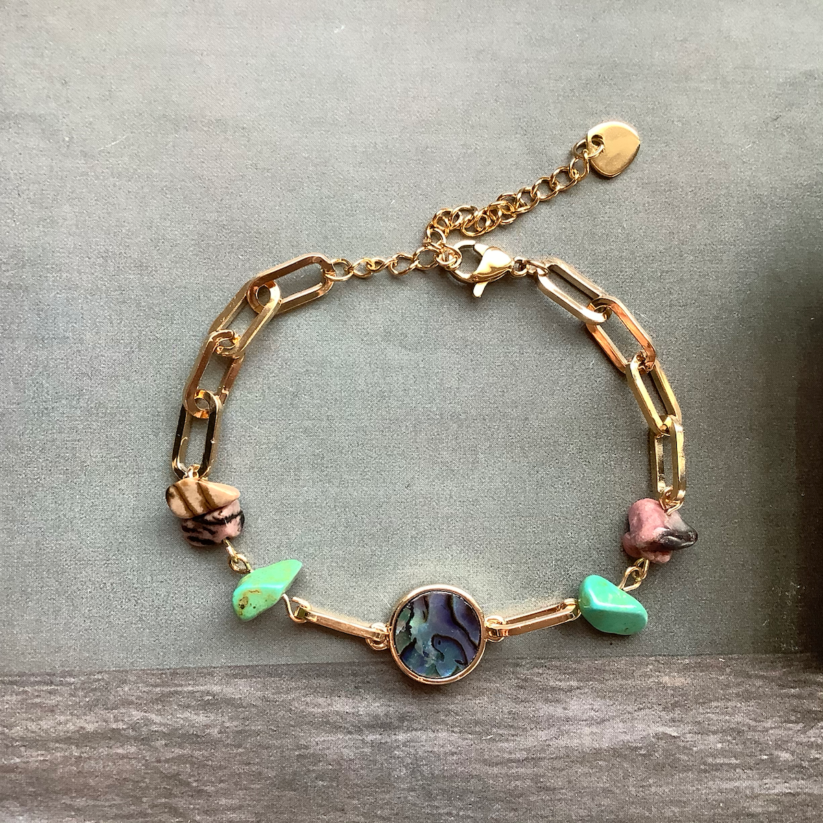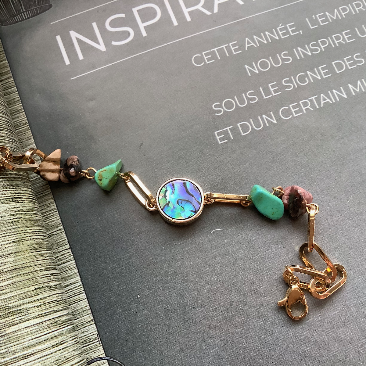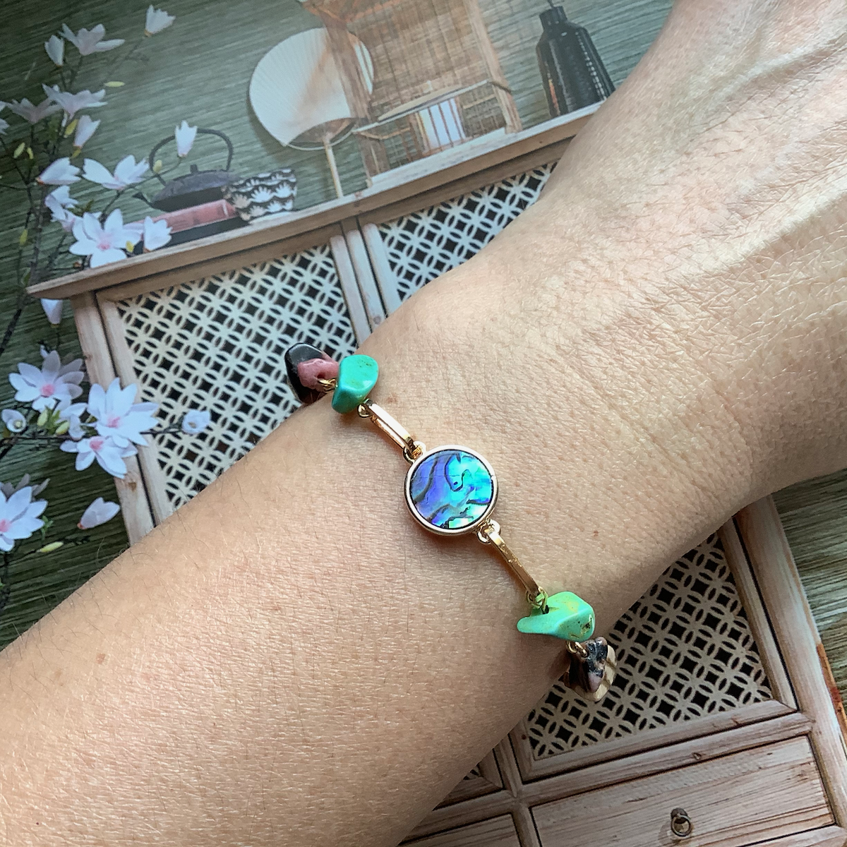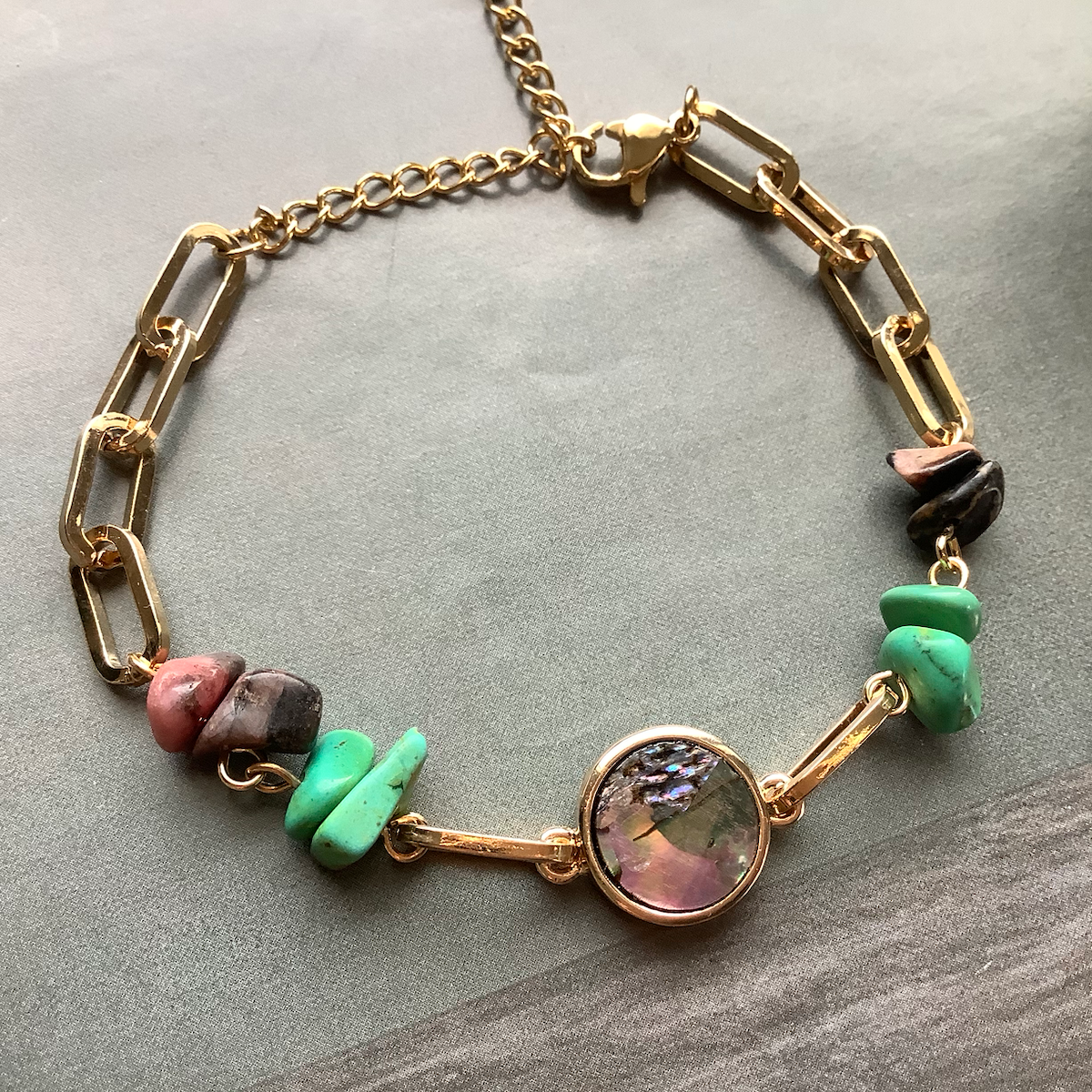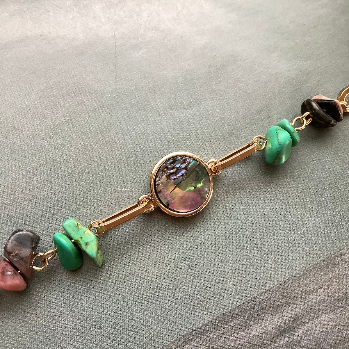 18K gold plated chain, natural irregular green turquoise gemstones, natural irregular multicolour rhodonite gemstones, natural blue abalone pendant, stainless steel clasp and extension chain.