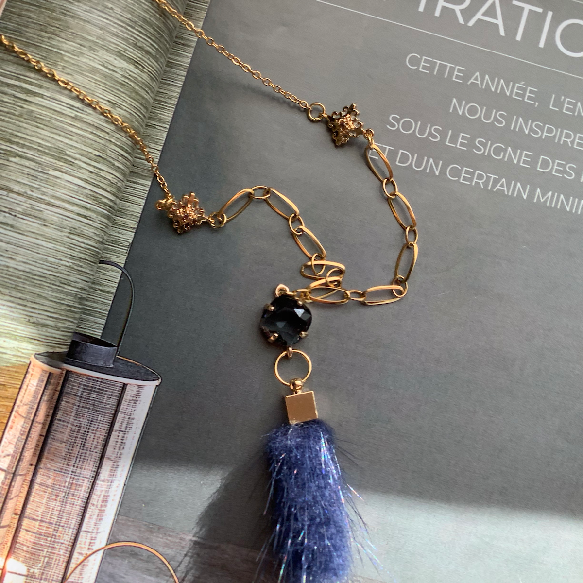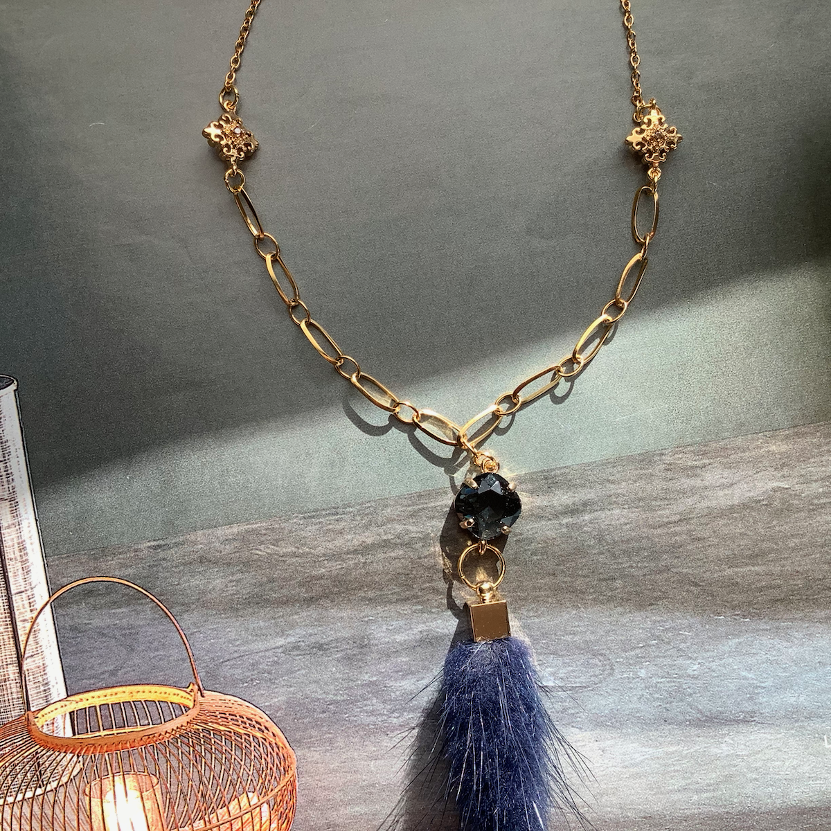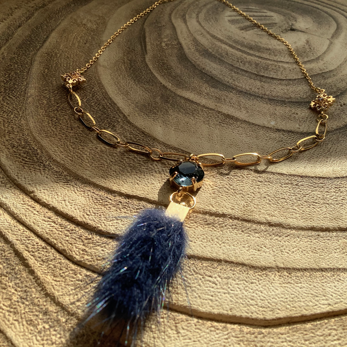 Stainless steel chain, 18K gold plated connectors, 18K gold plated natural fur pendant, stainless steel clasp and extension chain.
