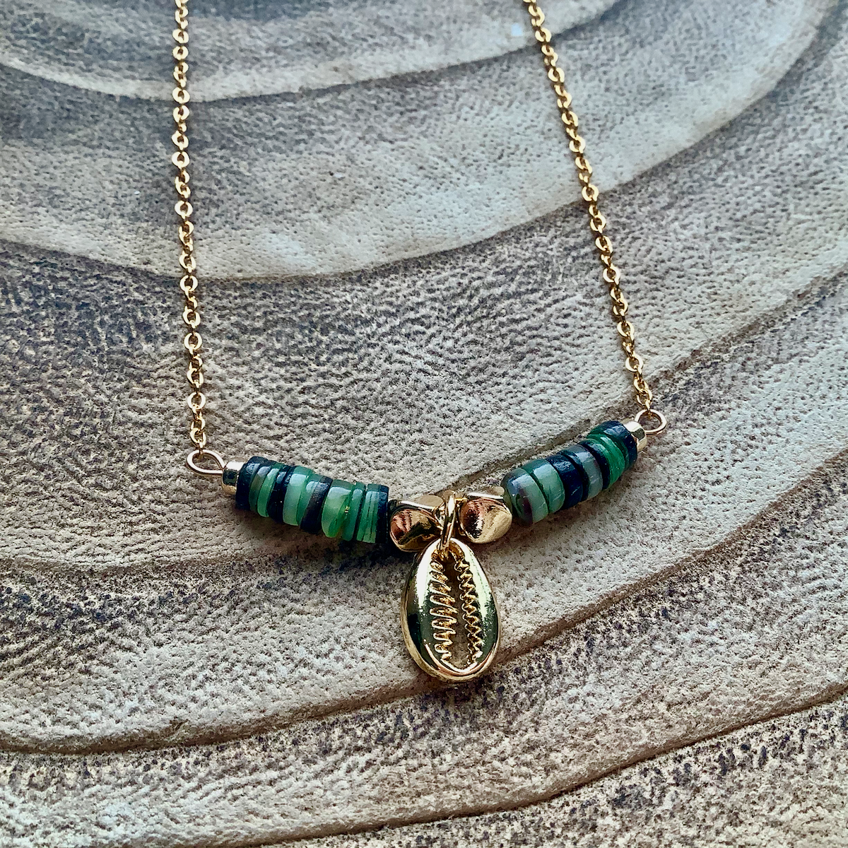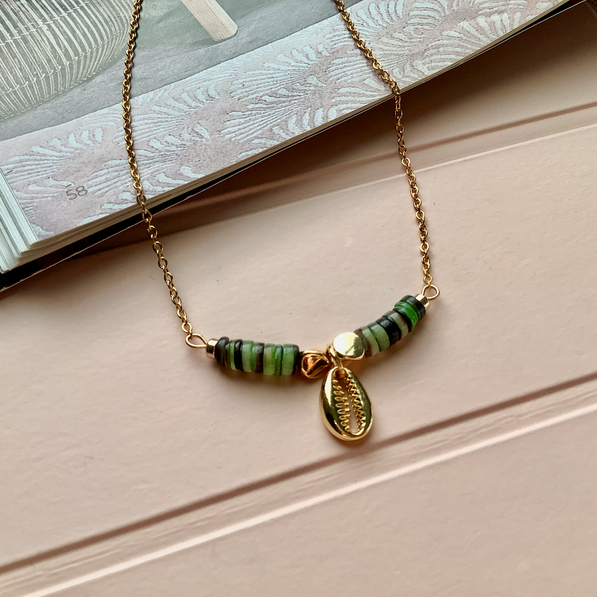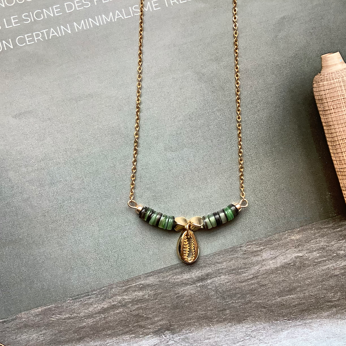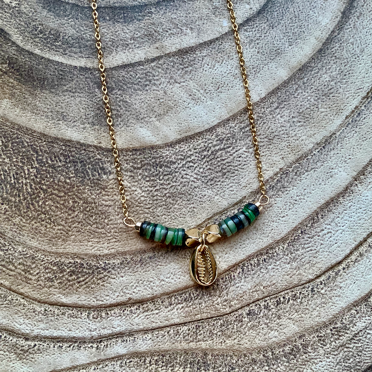 Stainless steel, 24K gold plated brass, 24K gold plated shell, natural seashell beads.
