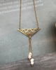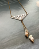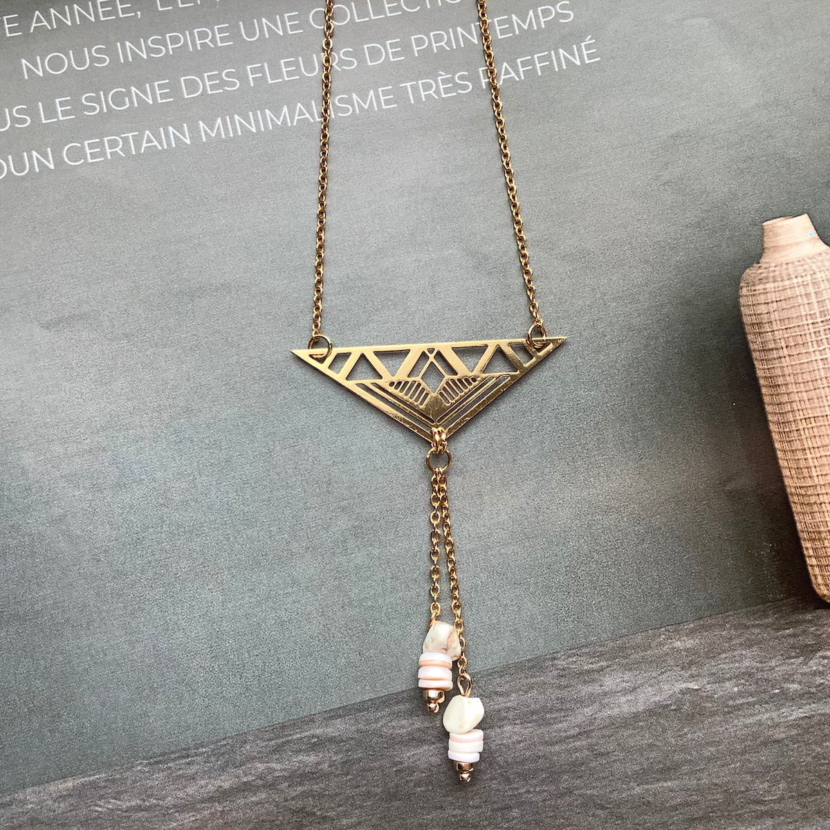 Stainless steel, 24K gold plated Maya triangle pendant, natural white turquoise gemstones, natural seashell beads.