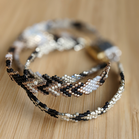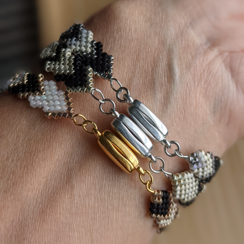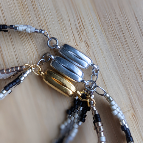 Japanese beads, stainless steel connecting parts, high quality magnetic clasp* (be aware that magnets are not recommended for pregnant women or persons with peacemakers).