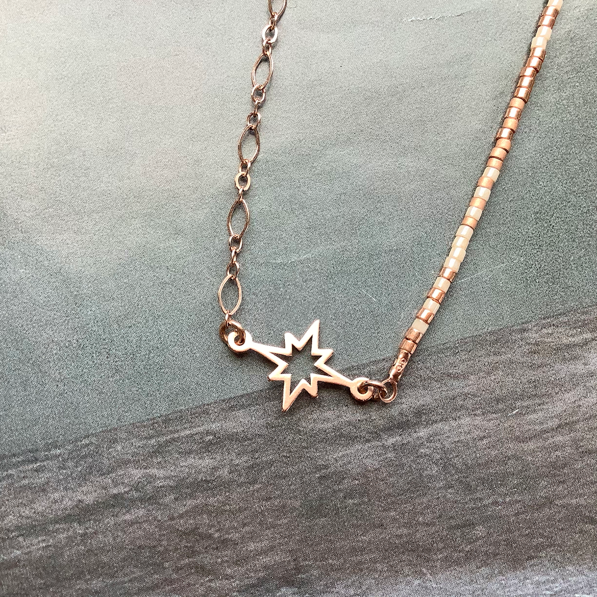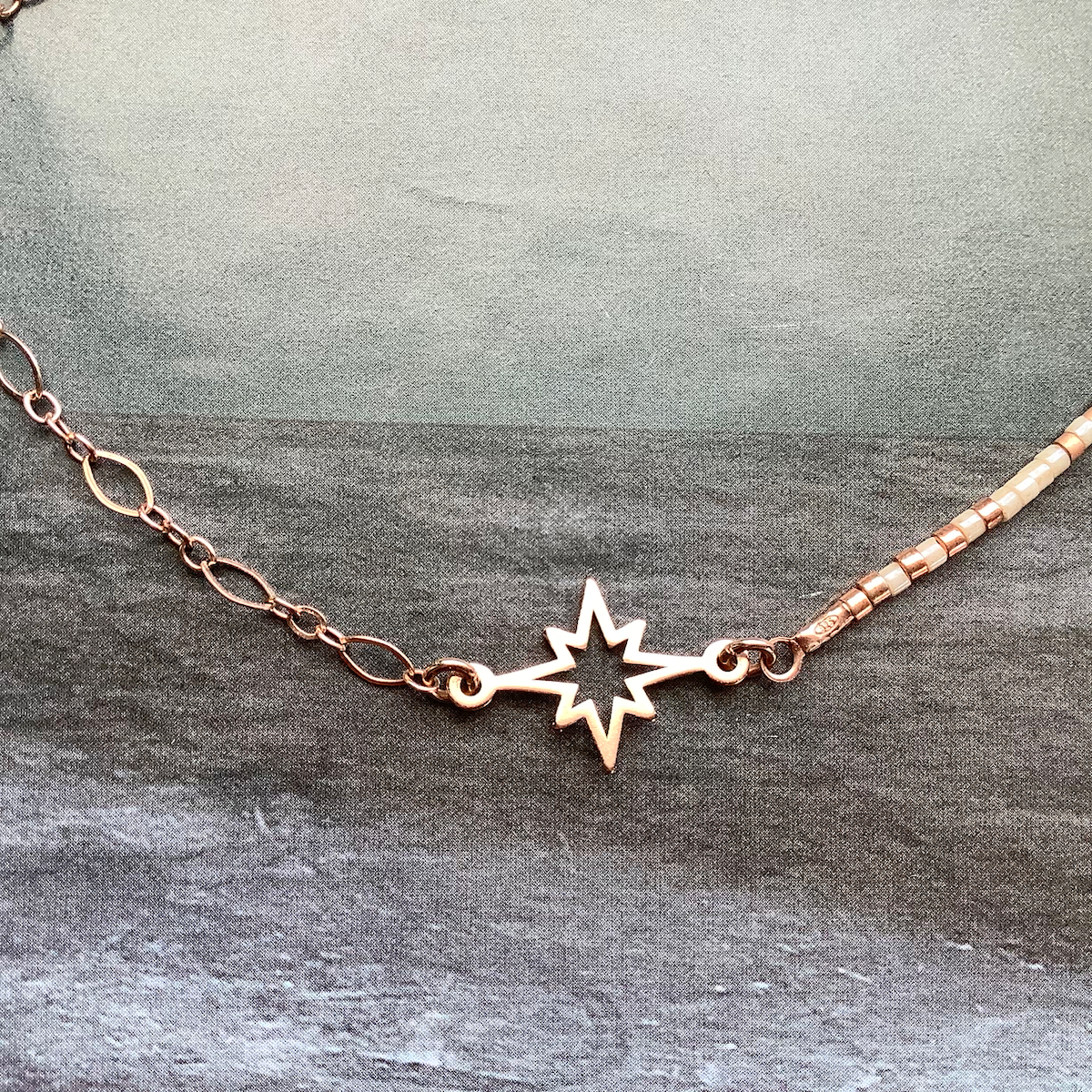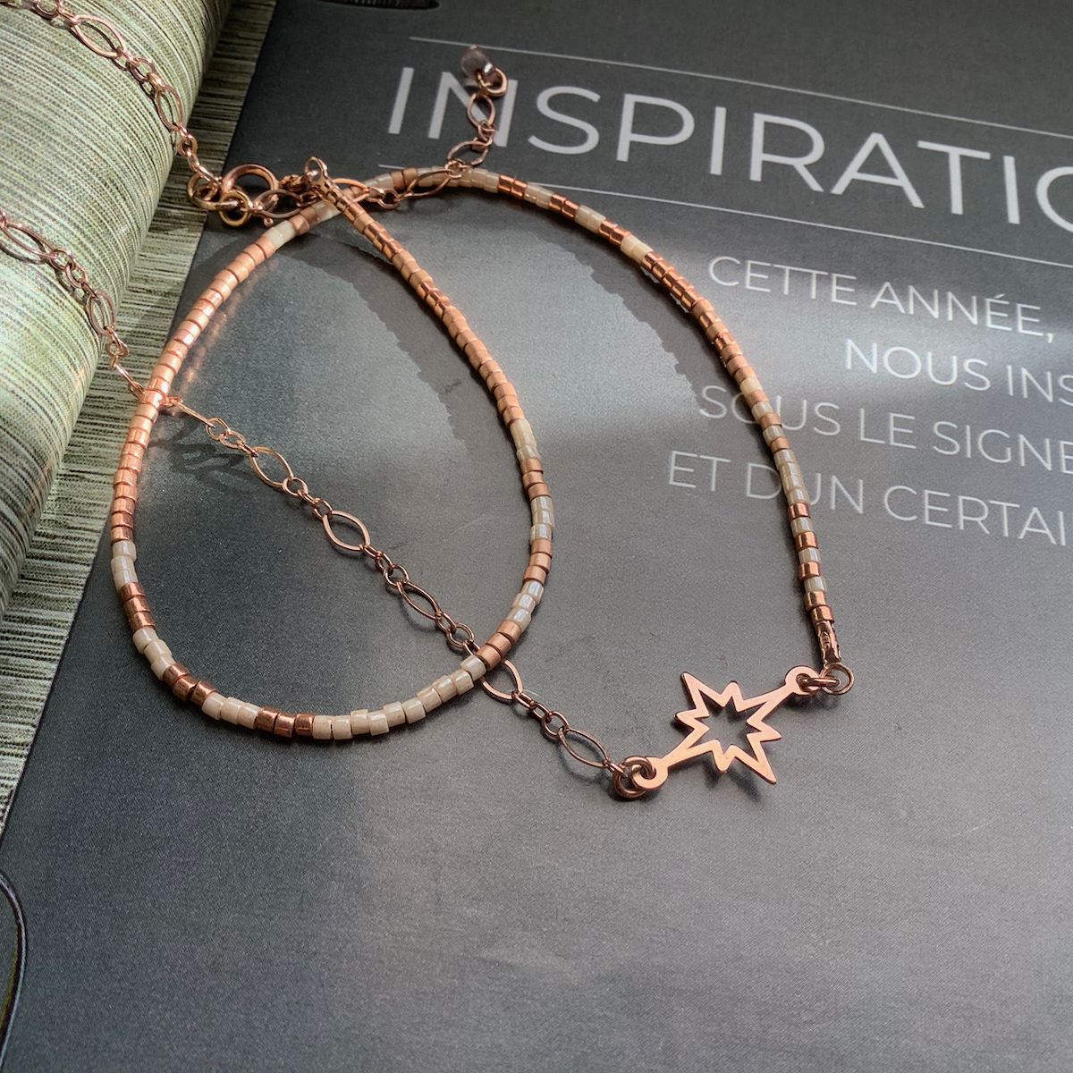 14K rose gold plated alternated chain, Japanese beads, silver 925 rose star pendant.