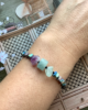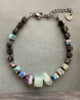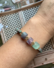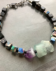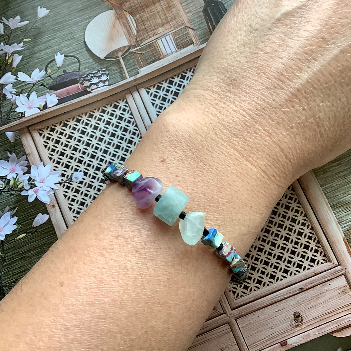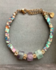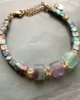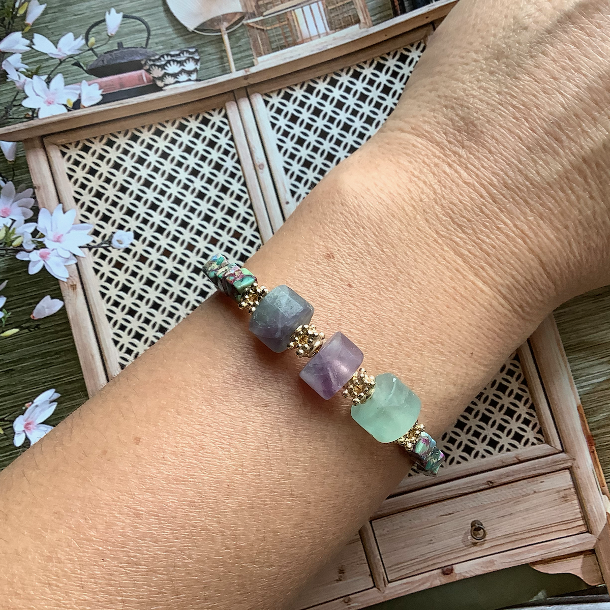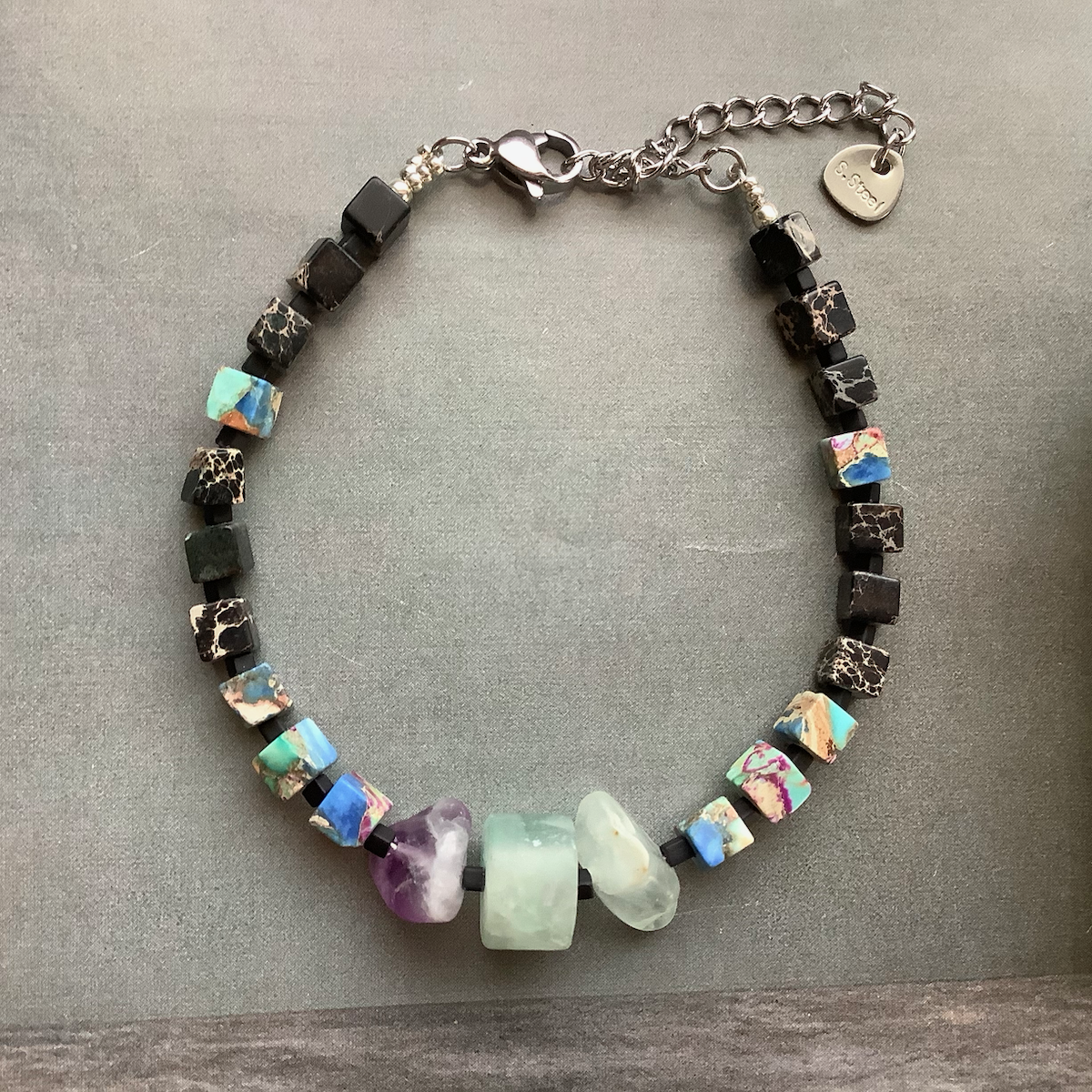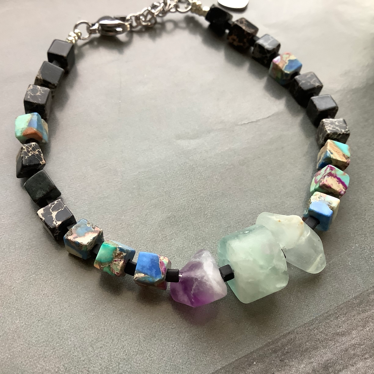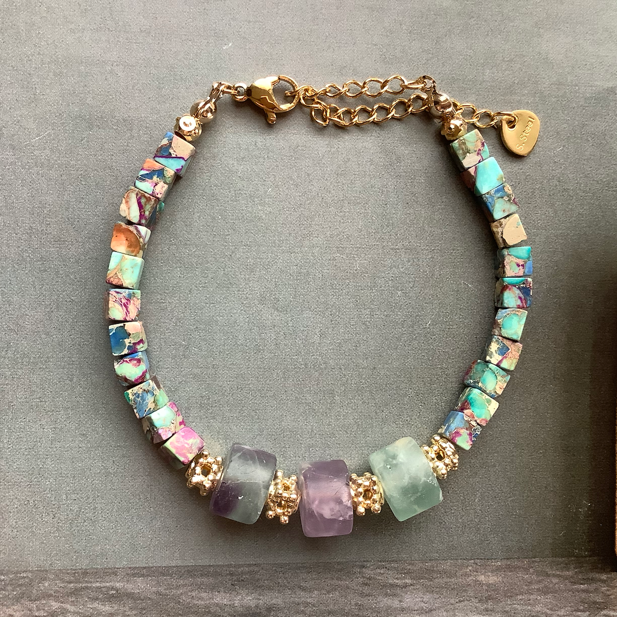 Natural sea sediment square beads, natural fluorite gemstones, 24K gold plated beads spacers, Japanese beads, stainless steel clasp and extension chain.