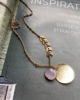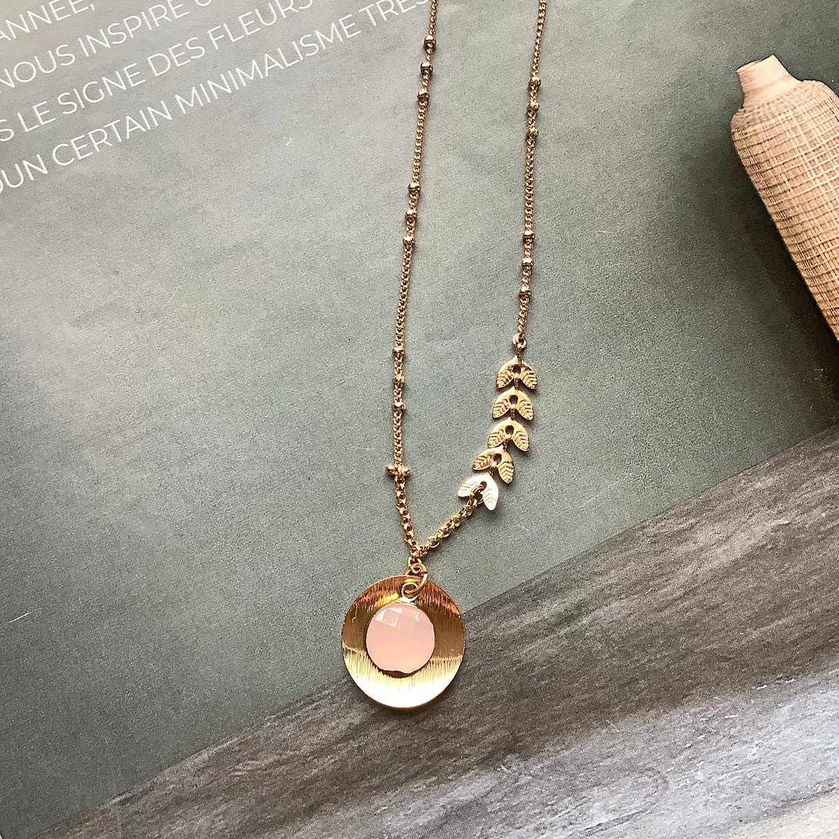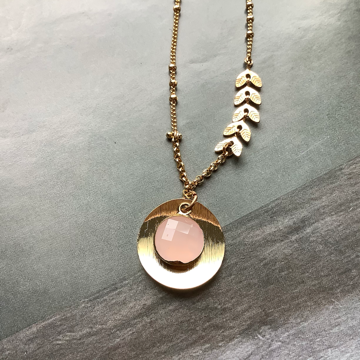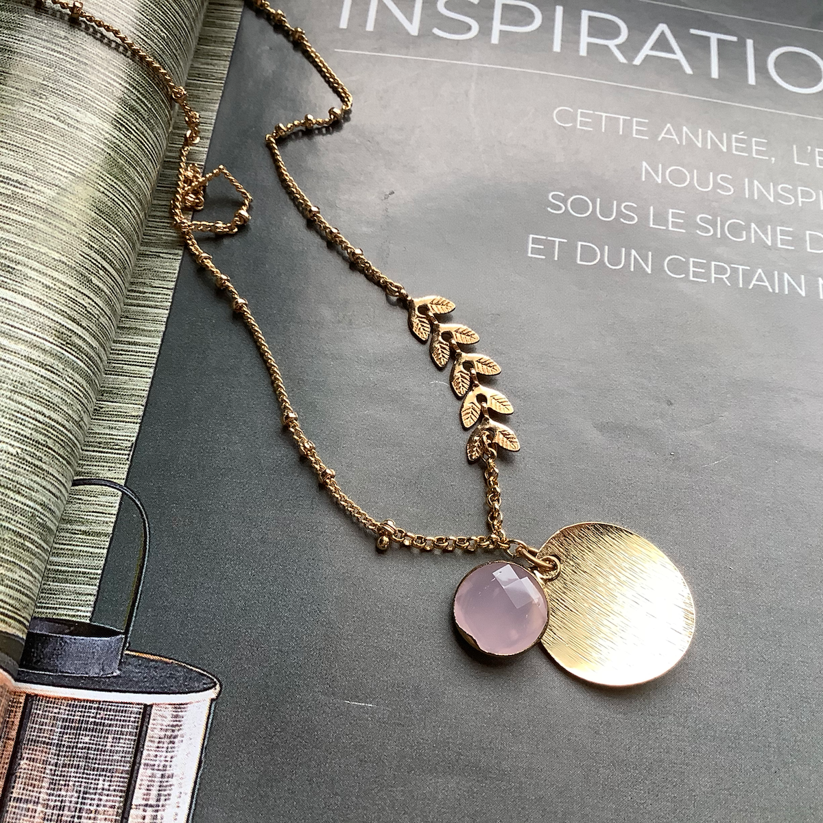 24K gold plated chains, 24K gold plated round disk pendant, high quality 10mm rose stone pendant.