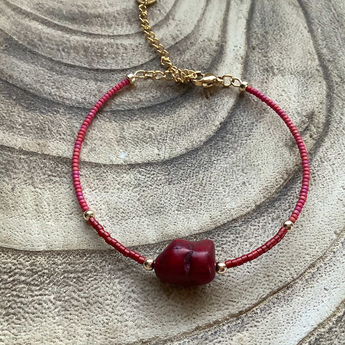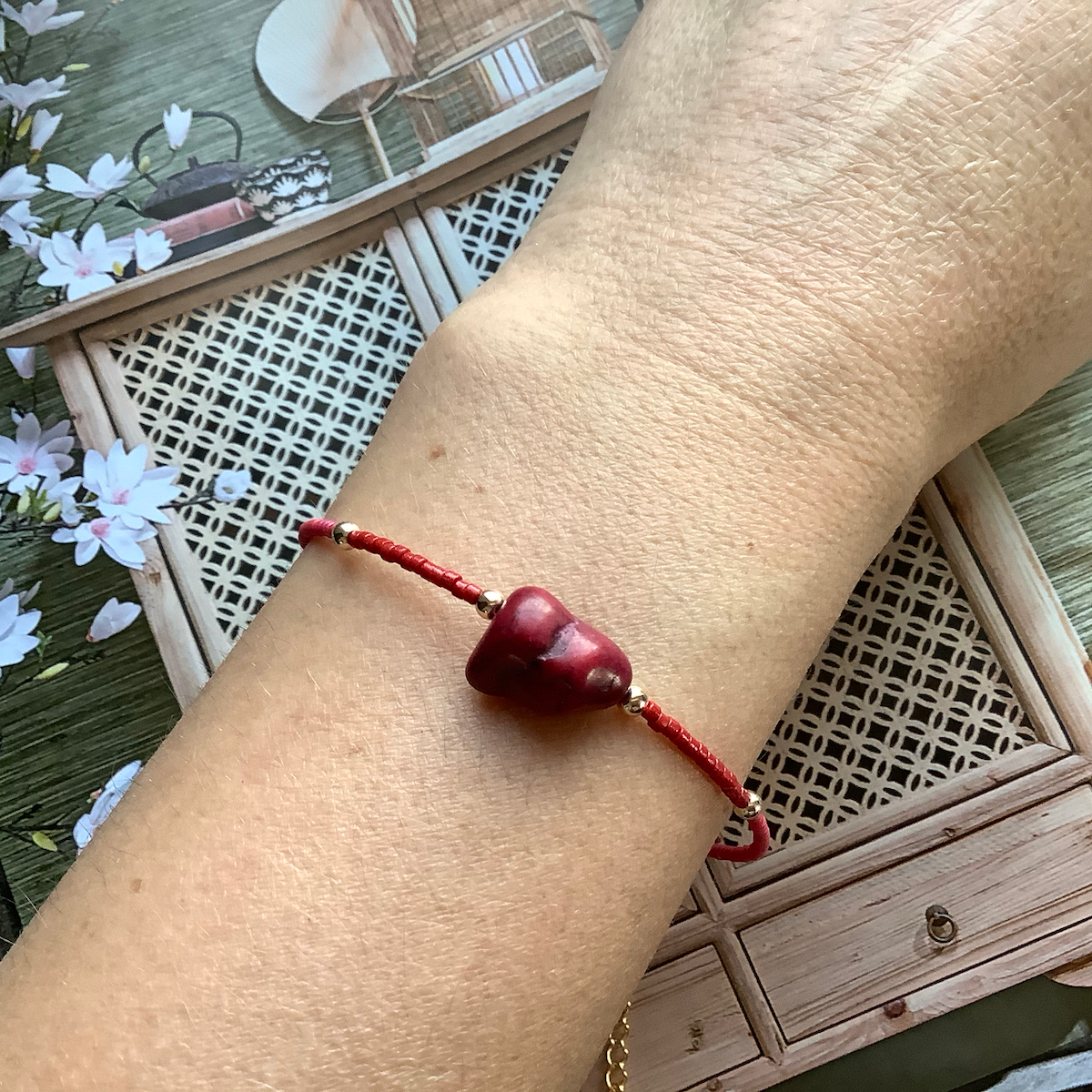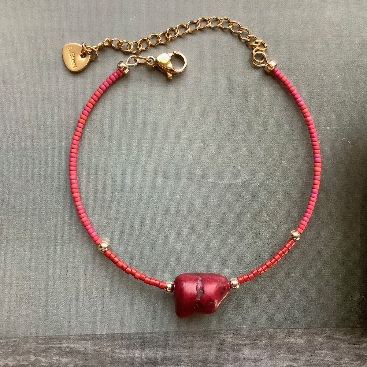 Japanese beads, red irregular handmade imitation stone, golden plated hematite spacer beads, high quality stainless steel wire and extension chain.