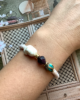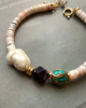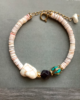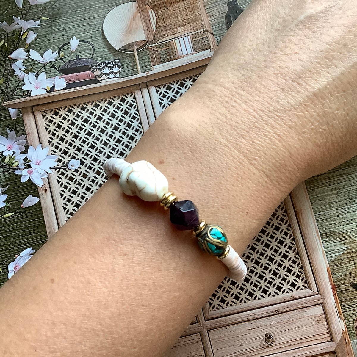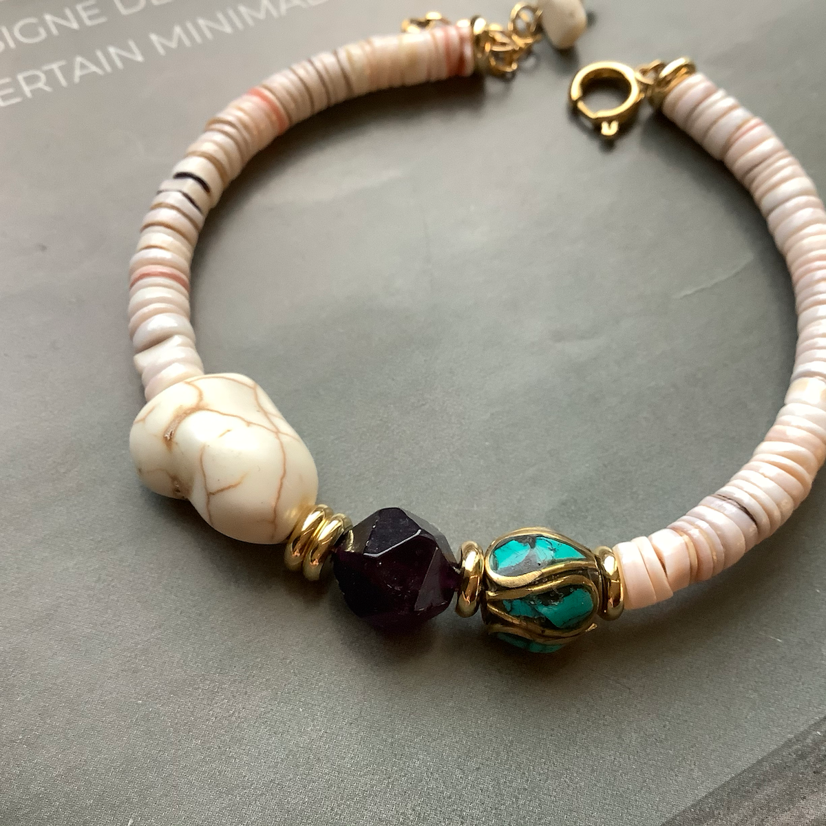 Natural seashell beads, natural stone Tibet bead, natural gemstone, irregular imitation white turquoise stone, 24K gold plated spacer beads, stainless steel clasp and extension chain.