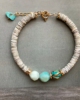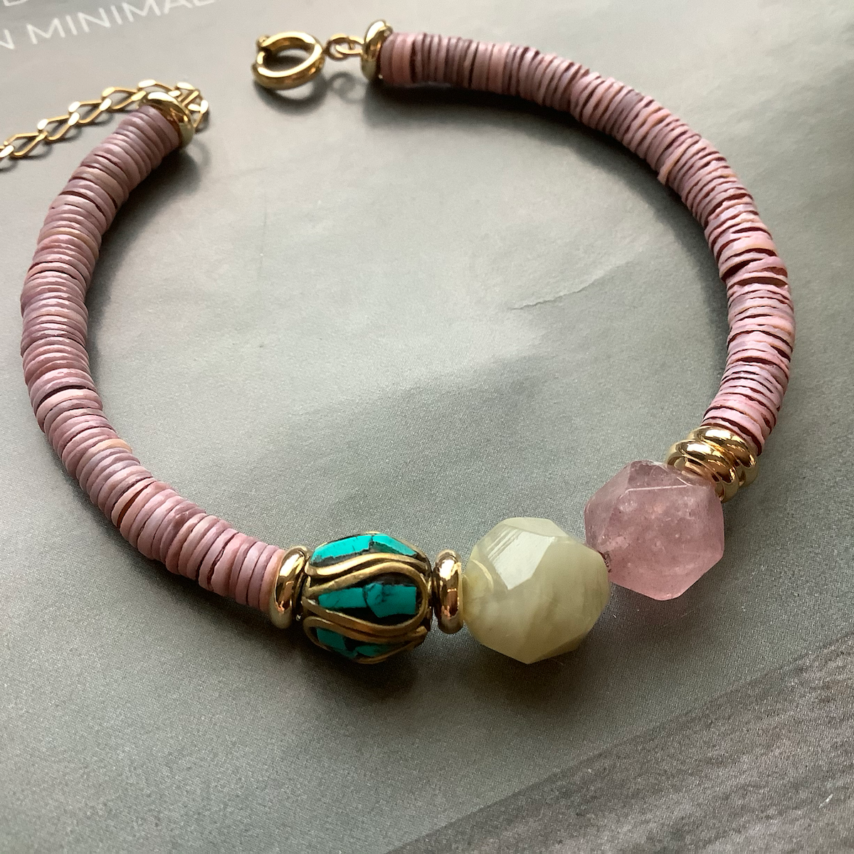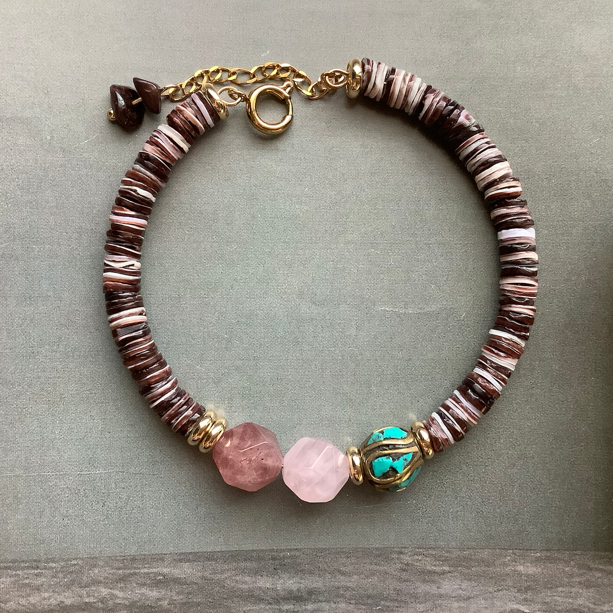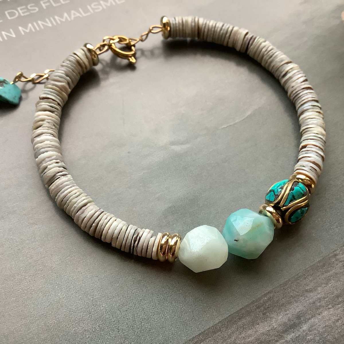 Natural sea shell beads, natural stone Tibet bead, natural gemstones, 24K gold plated spacer beads, stainless steel clasp and extension chain.