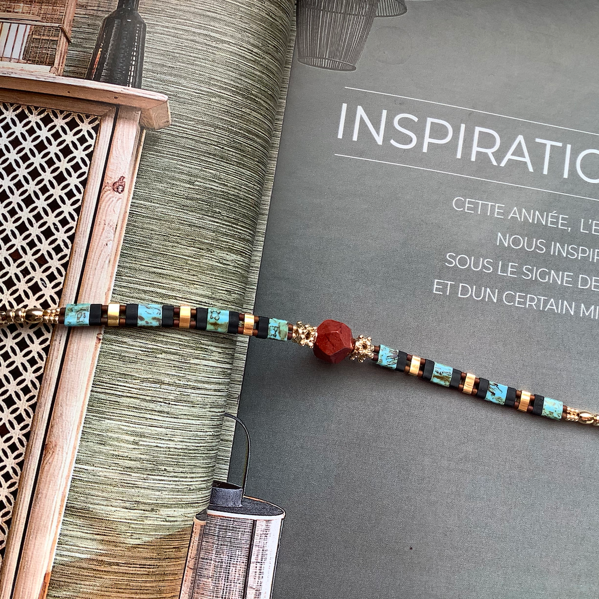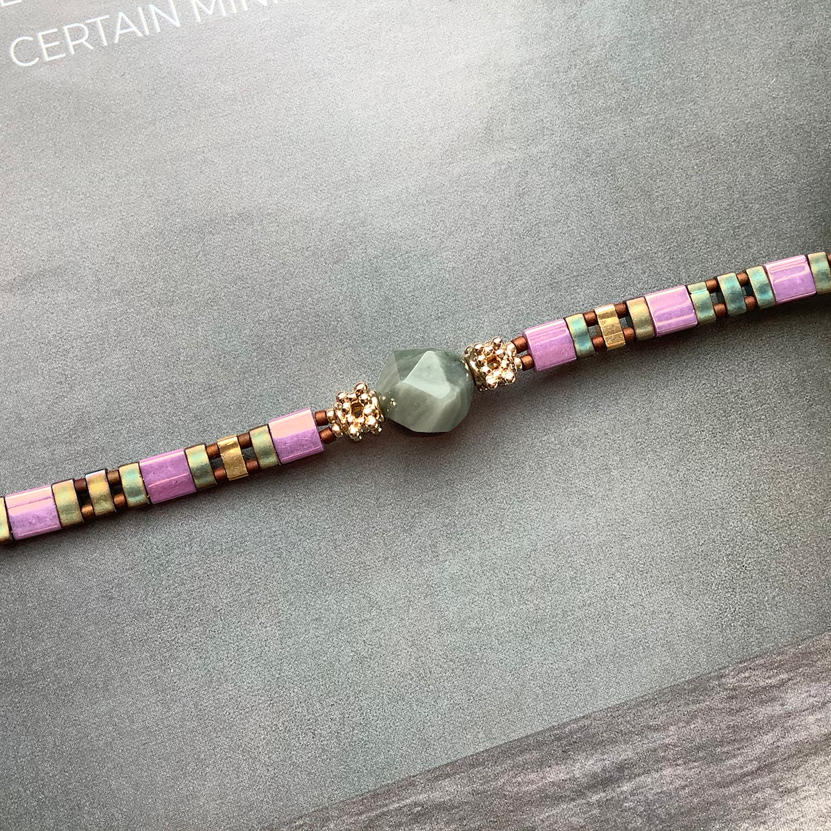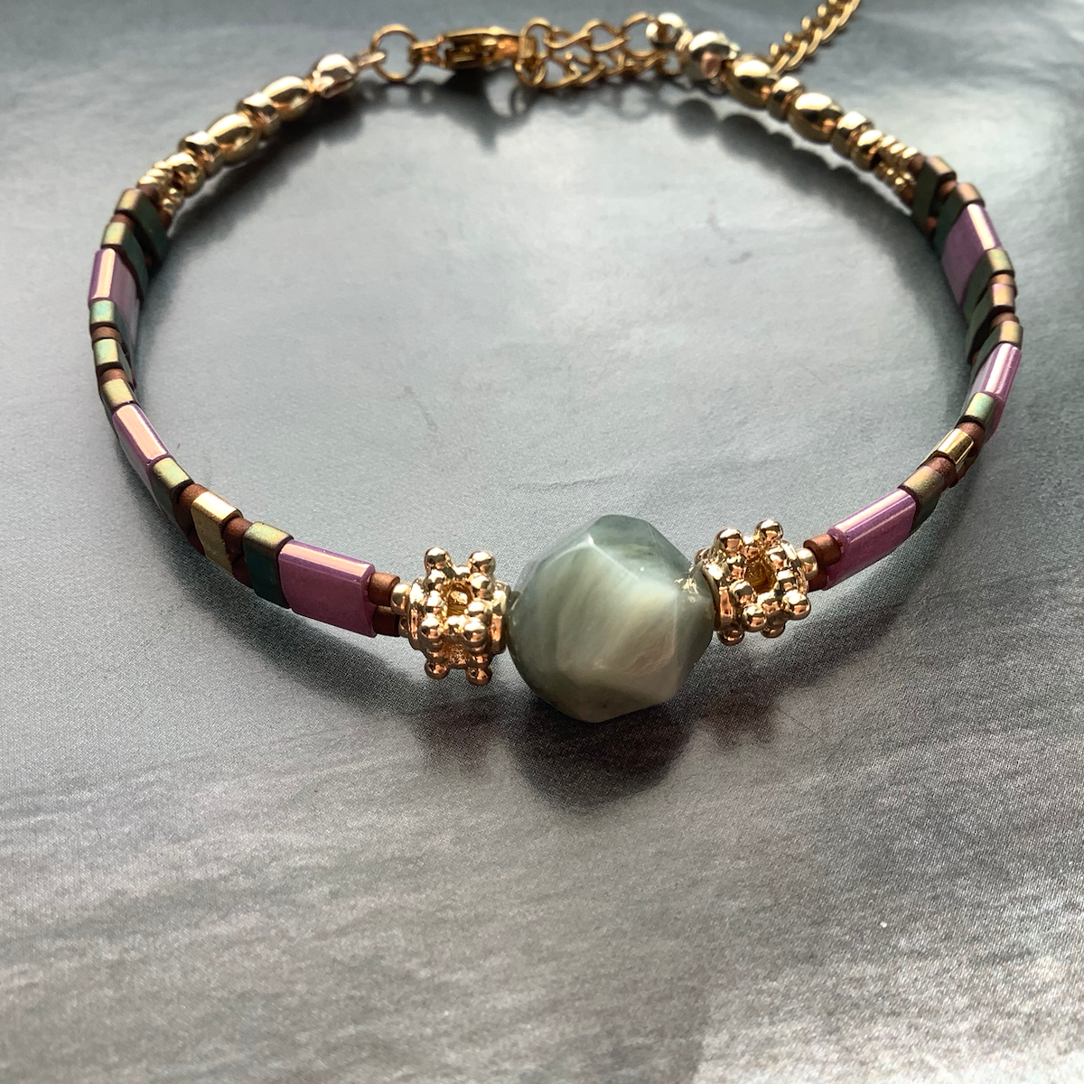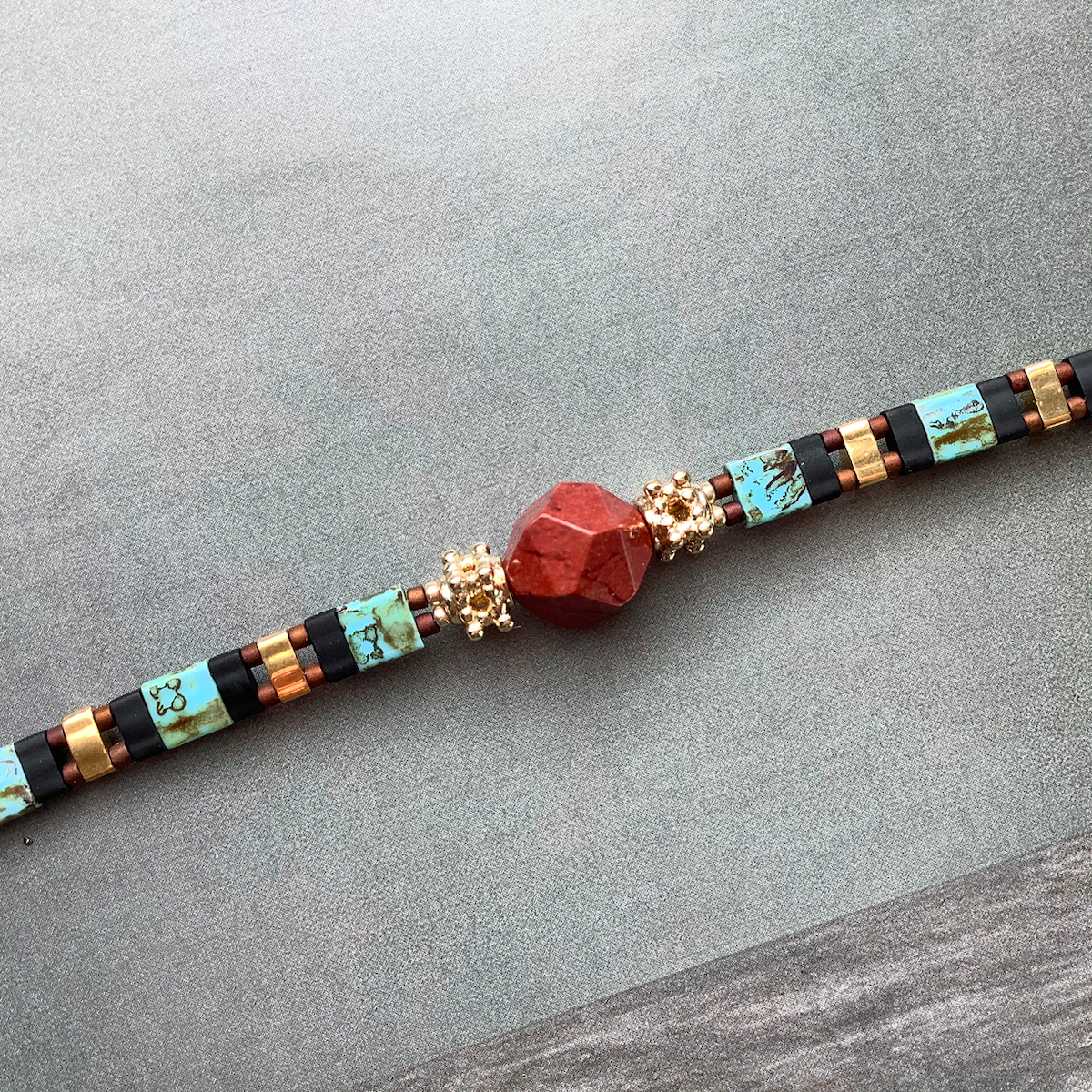 Japanese beads, natural geometric gemstone, 24K gold plated beads spacers, stainless steel clasp and extension chain.