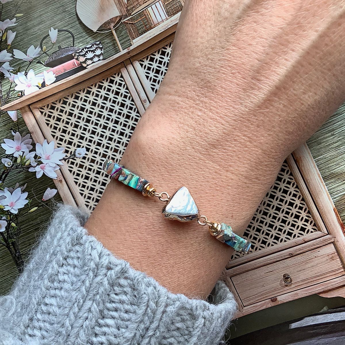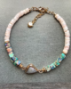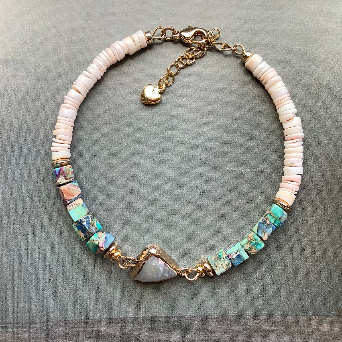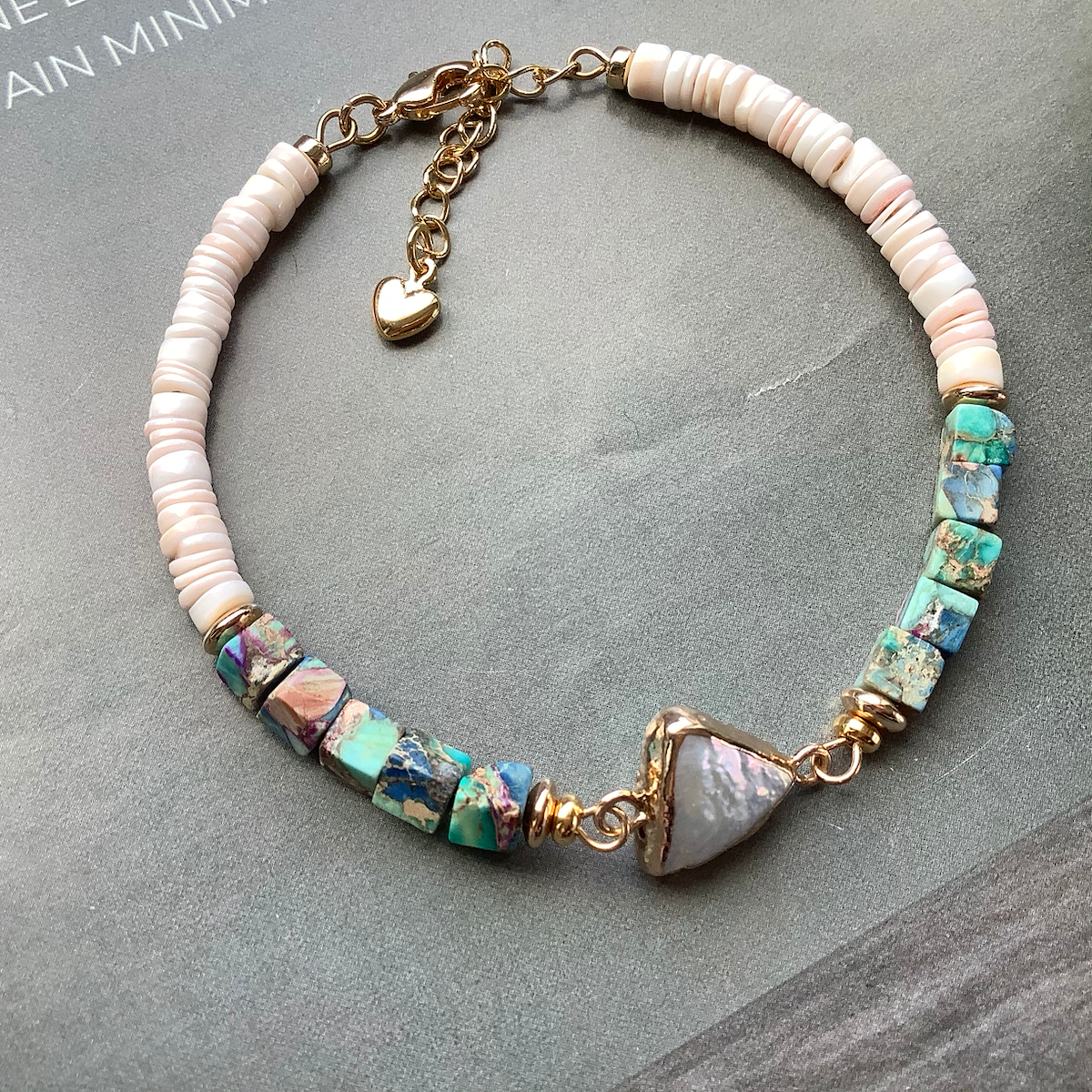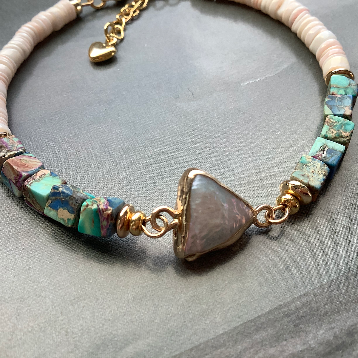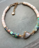 24K gold plated chain, natural seashell beads, natural sea sediment beads, natural seashell pendant, 24K gold plated smooth twisted beads spacers, clasp and extension chain.